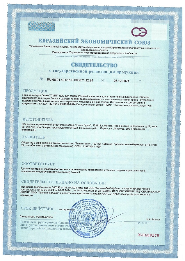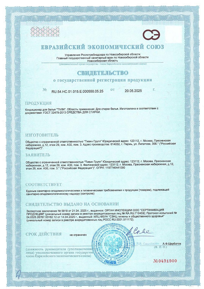 Свидетельство Гель для стирки белья TIVIN Универсальный