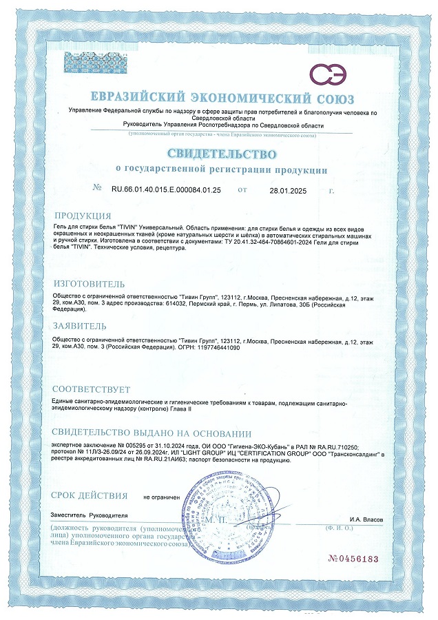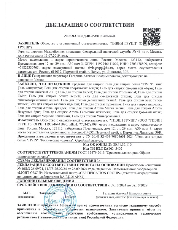 Свидетельство Гель для стирки белья TIVIN Универсальный