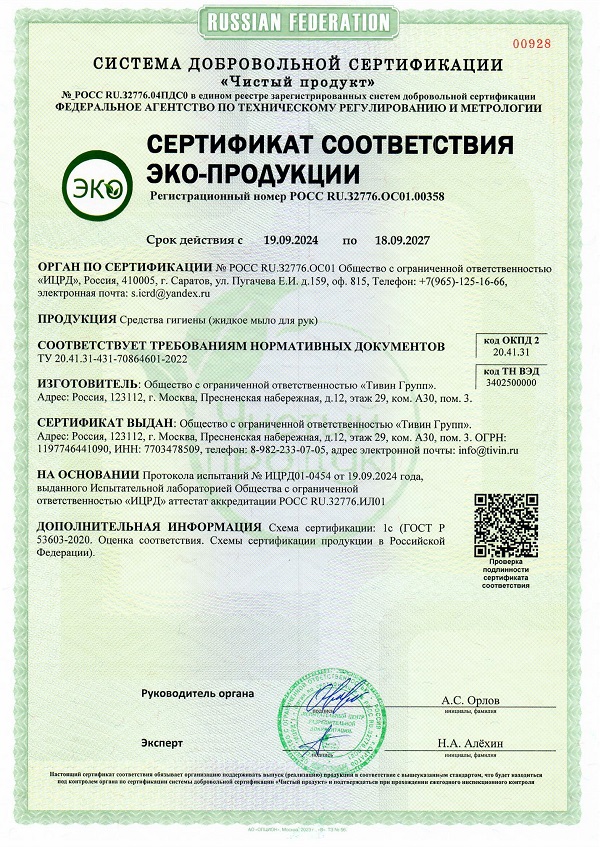 Сертификат соответствия ЭКО-продукции жидкое мыло для рук