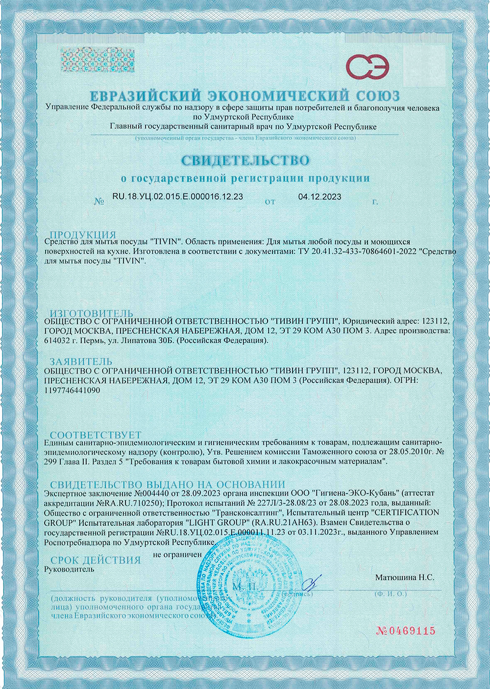 Свидетельство Универсальное чистящее моющее средство TIVIN