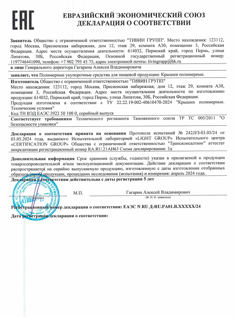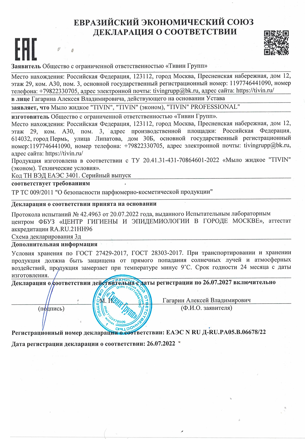 Декларация о соответсвии Мыло жидкое перламутровое TIVIN